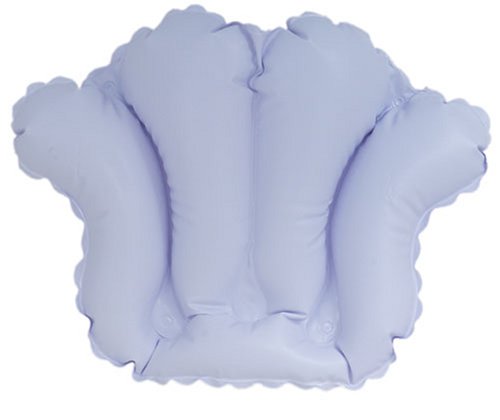 Inflatable bath pillow. Can be filled with air, hot or cold water. Offers dual valve system. Four suction cups hold the pillow firmly in place.